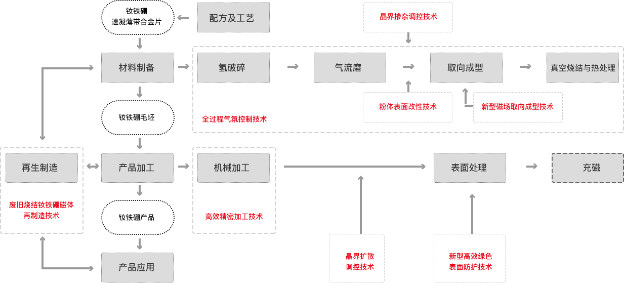 公司經(jīng)過(guò)多年的技術(shù)創(chuàng)新,形成了涵蓋磁體制備、機(jī)械加工、表面防護(hù)和再生制造等多個(gè)方面的燒結(jié)釹鐵硼磁體生產(chǎn)全過(guò)程核心技術(shù)體系。通過(guò)上述核心技術(shù),實(shí)現(xiàn)提高產(chǎn)品磁性能和服役特性、節(jié)約資源和成本等效果。