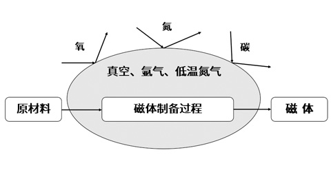 燒結(jié)釹鐵硼永磁材料的性能受材料中氮、氧、碳元素含量的影響,高氮、氧、碳含量消耗了材料中的稀土元素,導(dǎo)致材料的矯頑力、耐溫、耐腐蝕等性能的降低。