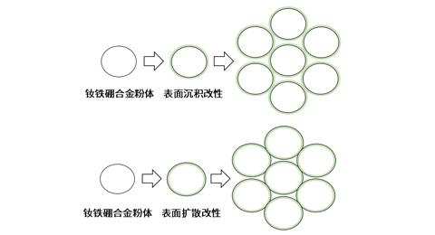公司創(chuàng)新開(kāi)發(fā)出多種釹鐵硼合金粉體表面改性技術(shù):包括物理氣相沉積重稀土金屬膜層技術(shù)、粉體表面擴(kuò)散改性技術(shù)、化學(xué)合成膜改性技術(shù)等。通過(guò)粉體表面改性,改善了粉體的流動(dòng)性和抗氧化性,提高了粉體表層的各向異性場(chǎng),最終提高了材料的矯頑力。
